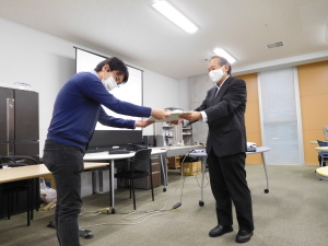 大島研究室創立20周年を祝って大島先生に向けた寄せ書きの受け渡しが行われました。