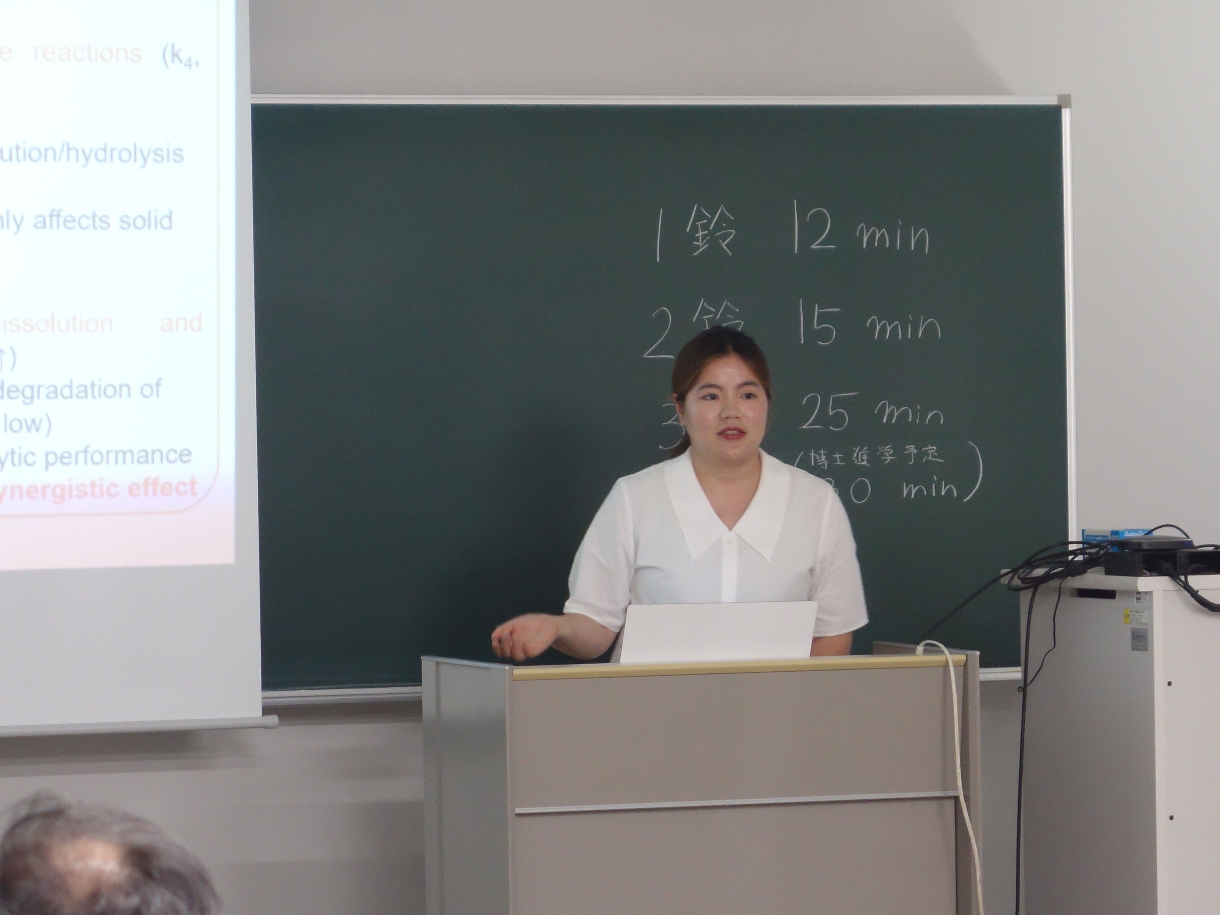 当研究室の、王 岱宇さん、羅 蘭さん、杜 宛玲さん、方 偲旭さんが修士課程の最終発表を行いました。 方さん、杜さん、羅さん、王さんの発表の様子です。 皆さんお疲れさまでした! 投稿ナビゲーション 超臨界流体部会第24回サマースクール 2025年度M2中間発表